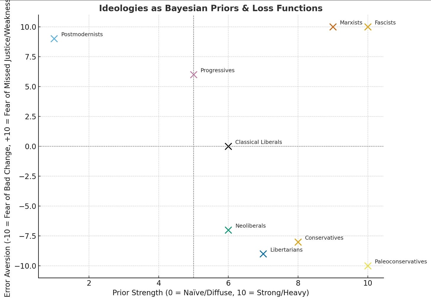 Fascists lock their prior on nation, blood, and destiny. They only accept evidence that glorifies the tribe. They fear weakness more than injustice. Their failure mode is posterior collapse: evidence stops mattering entirely, and authoritarian disaster follows.